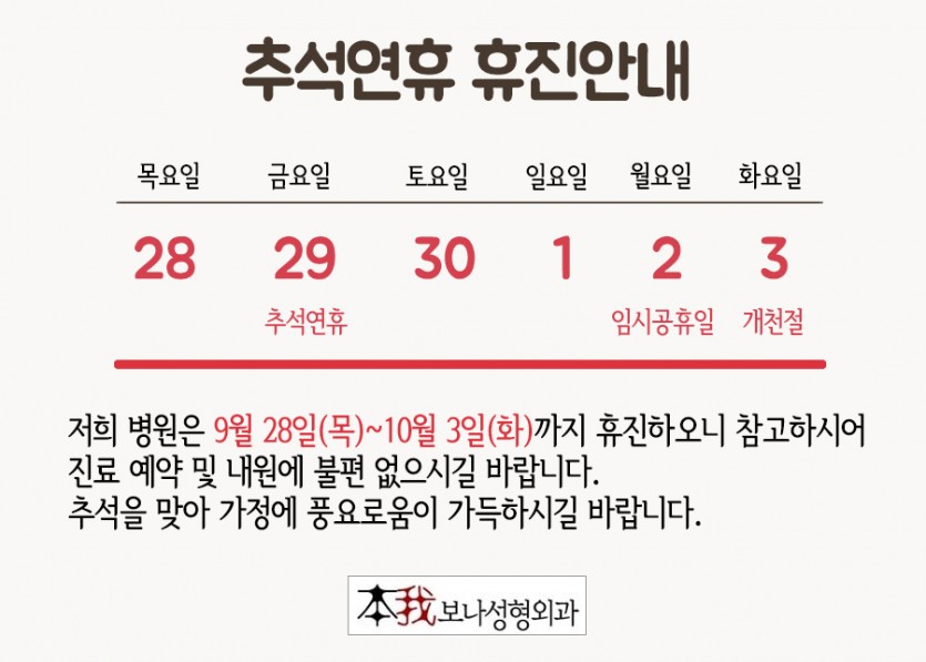 보나성형외과의 추석연휴 휴진일정을 안내 드립니다.